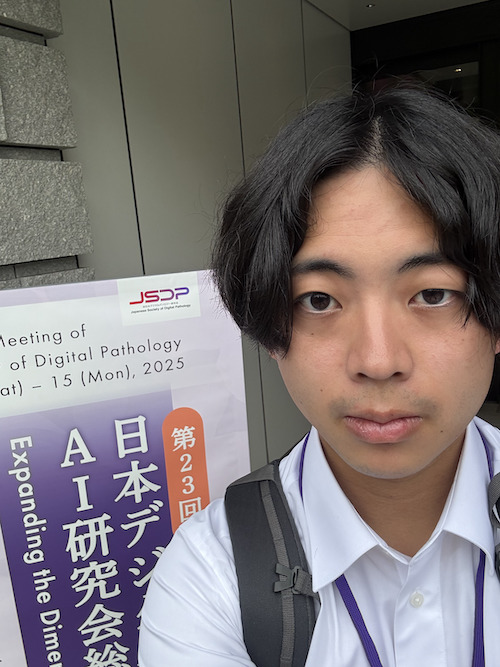 今回はポスターなどの発表もなく、自己研鑽のために参加させていただきました。会場が清水研から近かったこともあったかとは思いますが、これまでにこういった形でご支援いただくことがなかったため非常にありがたく感じています。病理学の分野としては薬学部時代にしっかり学んだこともなく、実際に学会の発表を聞いていてわからないことも多くあったことは事実ですが、エッセンスコースなどで消化器や循環器をはじめとした染色画像を少し見ていたこともあって、少なくとも学部時代の自分と比較すれば病理学に対するハードルは低かったように思います。現在の菱沼先生のように共同研究でお世話になる可能性もあるので、少なくともAIに関する部分については今後対応していけるように研鑽を積んでいきたいと感じました。