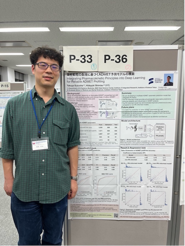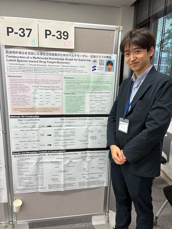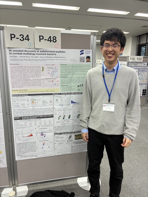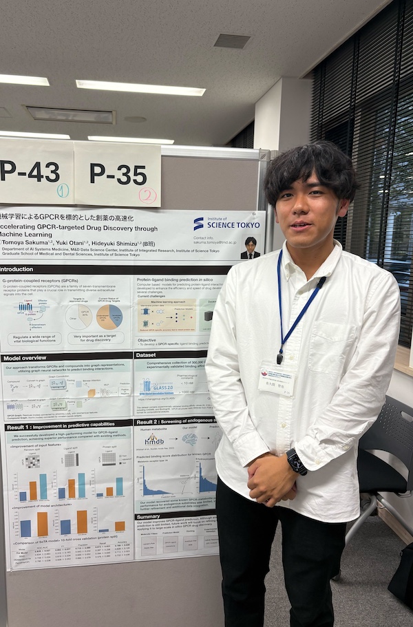 ポスター発表では本領域に関連するテーマとして取り組ませて頂いているGPCRを標的とした機械学習モデルの開発というテーマで発表させていただきました。情報科学のトップレベルの先生方に私の研究について見ていただく非常に貴重な機会となり、多くのサジェスチョン等を頂きました。また、異なる分野の先生方にも今回は発表する機会があり、異分野の先生方への説明の難しさなどを改めて実感するとともに、ただ機械学習モデルを構築するだけでなく、それを使ってどのような応用が行えるかを示すのが最も重要であるということを改めて実感する機会となりました。頂いたご意見などを参考に、本テーマに磨きをかけていきたいと思います。また、参加されていた研究者のポスター発表では、私の専攻である情報科学の最先端の研究を目にし、実際に肌感覚をお聞きすることができました。また、他の分野の発表も多くの先生方が分かりやすく説明していただき理解することができました。機械学習モデルの構築をしているとどうしても目先の評価指標にとらわれることが多いですが、こうしたアウトリーチを意識した上で研究を行っていきたいと改めて実感する貴重な機会となりました。