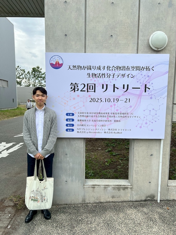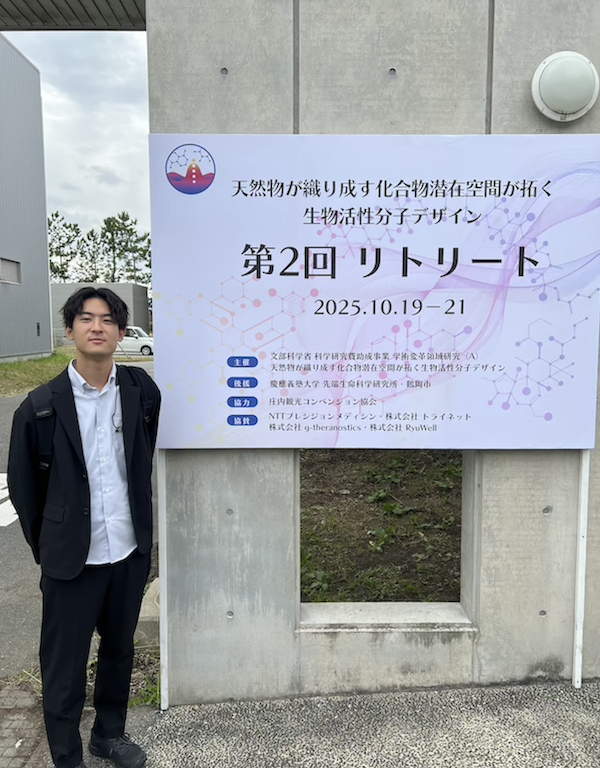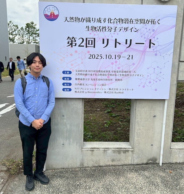 山形県鶴岡市にある慶応義塾大学・鶴岡キャンパスで行われたリトリートでは有機合成化学、ケミカルバイオロジー、情報科学など様々な分野のトップランナーが一同に集まり、分野を超えた活発な議論がされました。各班の先生方の口頭発表では、高度なアッセイ系の構築や画期的な合成経路の構築、機械学習による分子設計及びその基盤の構築など多岐にわたる研究内容が紹介され、本領域における研究の高さを実感するとともに、共同研究の進捗の報告などもあり、異分野の融合研究の実際を目のあたりにすることができました。また、今回は先端科学生命科学研究所の施設で開催されましたが、所長の荒川先生がお話くださった研究所が鶴岡に設立された経緯や研究所のビジョンに非常に感銘を受けました。サイエンスを通じて地方創生・地域活性化が実際に行われていることを目の当たりにしました。また、研究所発のスタートアップ企業のお話も聞くことができ、私の視野が大きく広がる経験となりました。また京都大学・奥野先生のご講演では国家規模で取り組んでいるAI創薬のプロジェクトの概観について理解することができ、研究体制・内容・広報などの取り組みなど大変勉強になりました。全体を通して、私の興味のあるご講演が目白押しのプログラムであり、大変勉強になりました。